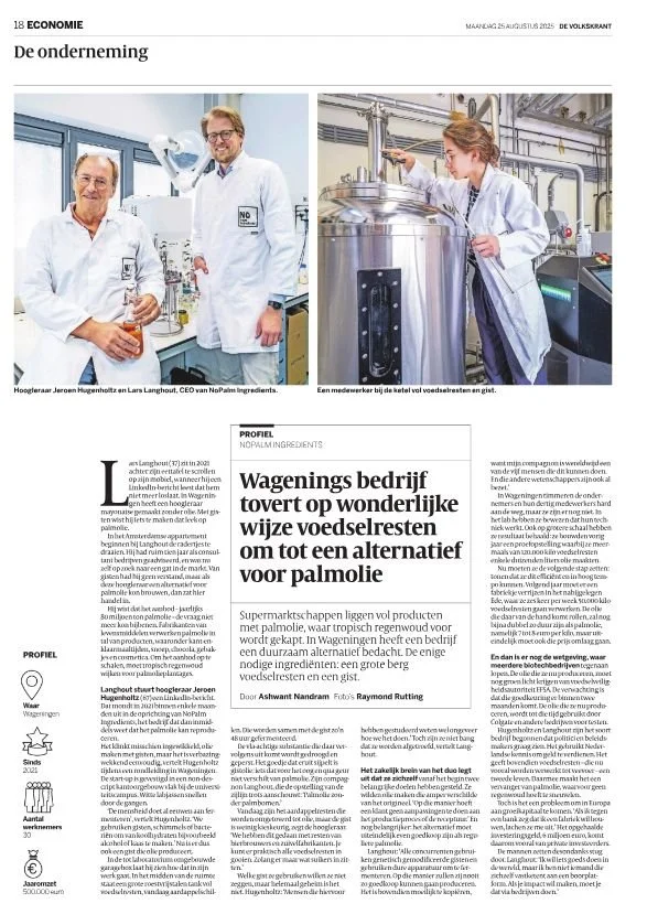 We are pleased to share that NoPalm Ingredients has been featured in De Volkskrant, one of the Netherlands’ leading national daily newspapers.