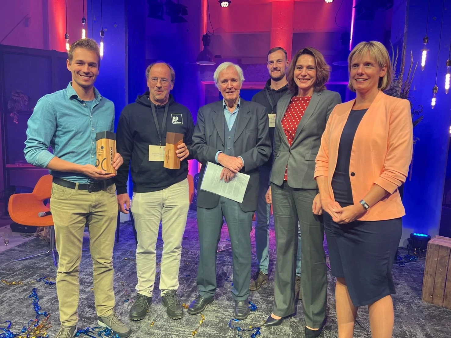 Our co-founder Jeroen Hughenholtz and process engineer Jochem De Vries receiving the ambition prize from Mr. Jan Terlouw.